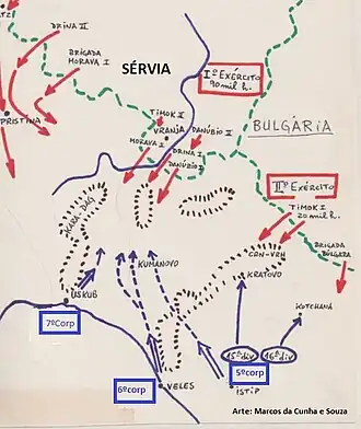 At the other side, as soon as his forces were deployed, Zeki Pasha decided to take the offensive towards Kumanovo. In the evening of 22 October, Vardar Army gathered in the valley of Pčinja River. While Zeki Pasha had the precise information about the strength and disposal of the Serbian forces, the Serbian command did not realise that the battle with the main Ottoman force would start the very next morning.[10] Not expecting the attack, Serbs did not fortify their positions, which were topographically strong. Still, only two out of five infantry divisions were deployed in the front echelon – Danube Division I on the left wing, with the Cavalry Division behind it, and Morava Division I on the right wing. The left flank was particularly vulnerable, because Srtevica, the important topographic object, was defended by local irregulars.[1]