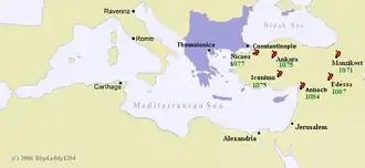 In hindsight, both Byzantine and modern historians are unanimous in dating the decline of Byzantine fortunes to this battle. As Paul K. Davis writes, "Byzantine defeat severely limited the power of the Byzantines by denying them control over Anatolia, the major recruiting ground for soldiers. Henceforth, the Muslims controlled the region. The Byzantine Empire was limited to the area immediately around Constantinople, and the Byzantines were never again a serious military force."[49] It is also seen as one of the root causes for the later Crusades, in that the First Crusade of 1095 was originally a western response to the Byzantine emperor's call for military assistance after the loss of Anatolia.[50] From another perspective, the West saw Manzikert as a signal that Byzantium was no longer capable of being the protector of Eastern Christianity or of Christian pilgrims to the Holy Places in the Middle East. Delbrück considers the battle's importance exaggerated, but the evidence makes clear that it resulted in the Empire's inability to put an effective army into the field for many years.[51]