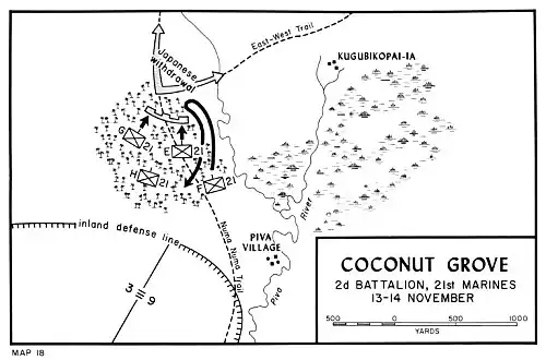The Battle of the Coconut Grove was a battle between United States Marine Corps and Imperial Japanese Army forces on Bougainville Island during the Pacific War. The battle took place on 13–14 November 1943 during the Bougainville campaign, coming in the wake of a successful landing around Cape Torokina at the start of November, as part of the advance towards Rabaul as part of Operation Cartwheel.