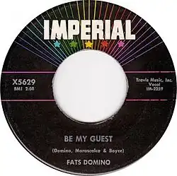 "Be My Guest" is a song written by Fats Domino, John Marascalco and Tommy Boyce. Arranged and produced by Dave Bartholomew and recorded by Domino on September 26, 1959,[1] it was released as a single by Imperial Records the following month and reached number 8 on the Billboard pop chart, number 2 on the R&B chart,[2] and number 11 on the UK singles chart.[3]