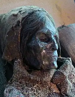 The "Beauty of Loulan" (also "Beauty of Krorän"). Museum exhibit and detail of the face, Xinjiang Museum.[1]