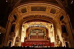 The long-delayed premiere of Smetana's opera Libuše finally arrived when the National Theatre opened on 11 June 1881. He had not initially been given tickets, but at the last minute was asked into the theatre director's box. The audience received the work enthusiastically, and Smetana was called to the stage repeatedly.[94][95] Shortly after this event the new theatre was destroyed by fire; despite his infirmities, Smetana helped to raise funds for the rebuilding.[93][96] The restored theatre reopened on 18 November 1883, again with Libuše.[93]