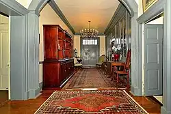Perhaps the most notable feature in the house is a wooden partition that can be removed (by taking out the baseboard and kicking the panels out on dowels) to join the drawing room and the central hall into a 20 x 30 foot room for great occasions.[12] The partition is fully paneled on both sides, both above and below the chair rail. Complete with a 10-pane casement window on either side of the partition door, the design is extraordinary.
