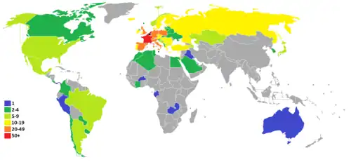 Note: countries considered as a continuity by the FIFA are put in italics. Their statistics are in fact composed of multiple countries that are also included separately.