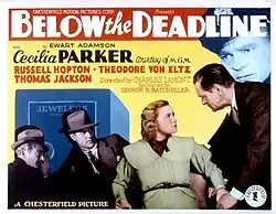 Below the Deadline is a 1936 American crime drama film directed by Charles Lamont and starring Cecilia Parker, Russell Hopton and Theodore von Eltz. It was produced and distributed by Chesterfield Pictures, which focused on low-budget productions and was soon after merged into Republic Pictures.