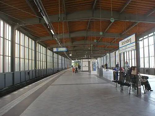 The Schöneberg station was opened on 1 March 1933 as a two-level exchange station between the Wannseebahn suburban line and the Berlin Ringbahn circular railway, in the course of the electrification of the Wannseebahn suburban line. Its Ringbahn level replaced the older Ebersstraße station on the Ringbahn, which was located slightly further west. The entry of the closed station was kept as entry to the western end of the Ringbahn platform of the new exchange station.[2]