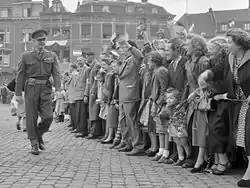 Shooting of a scene for Betrayed in Maastricht. Clark Gable walks past a crowd (1953)