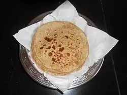 Bihari cuisine include litti chokha,[2] a baked salted wheat-flour cake filled with sattu (baked chickpea flour) and some special spices, which is served with baigan bharta,[3] made of roasted eggplant (brinjal) and tomatoes.[4][5] Dairy products are consumed frequently throughout the year, including dahi (yogurt), spiced buttermilk (known as mattha), ghee, lassi and butter.