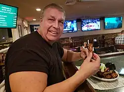 William Simmons (born November 1, 1961), known as El Wingador, is a competitive eater, author, entrepreneur, speaker and former member of the International Federation of Competitive Eating (IFOCE). Simmons achieved notoriety after winning Philadelphia's Sports Radio 94 WIP's Wing Bowl in January, 1999. Simmons eventually went on to win the competition five times (Wing Bowl IX, X, XI and XIII) between 1999 and 2005,[1] becoming the only eater in Wing Bowl history to accomplish that feat. During Wing Bowl 14 in February 2006, Simmons' was inducted into the Wing Bowl Hall of Fame, and his name appears on a banner in the rafters at Philadelphia's Wells Fargo Center, the site of Wing Bowl since Wing Bowl VIII in 2000. At the peak of his eating prowess, Simmons stood at 6’5” and weighed 290 pounds.[2]