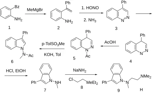 Grignard reaction of 2-aminobenzophenone [2835-77-0] (1) with methylmagnesium bromide and dehydration of the tertiary carbinol gives 2-(1-phenylvinyl)aniline [64097-92-3] (2). In an example of the Widman-Stoermer Synthesis, treatment with nitrous acid followed by basification of the diazonium species with ammonia causes an intramolecular cyclization to afford 4-phenylcinnoline [21874-06-6] (3). Hydrogenation would give 4-Phenyl-1,4-dihydrocinnoline, CID:14175750 (4). The presence of acetic acid gives (5). The reaction with Methyl p-toluenesulfonate [80-48-8] leads to CID:20337750 (6). Acid hydrolysis gives N-methyl-3-phenylindol-1-amine [57647-15-1] (7). Sodamide is then used to abstract the amine proton; alkylation of then anionic species with 2-dimethylaminoethylchloride [107-99-3] (8) then concludes the synthesis of binedaline (9).
