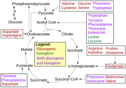 Normally, amino acids do not provide the bulk of fuel substrates. However, in times of glycolytic or ATP crisis, amino acids can convert into pyruvate, acetyl-CoA, and citric acid cycle intermediates.[13] This is useful during strenuous exercise or starvation as it provides faster ATP than fatty acids; however, it comes at the expense of risking protein catabolism (such as the breakdown of muscle tissue) to maintain the free amino acid pool.[13]