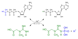 When the phosphagen system has been depleted of phosphocreatine (creatine phosphate), the resulting AMP produced from the adenylate kinase (myokinase) reaction is primarily regulated by the purine nucleotide cycle.[10]