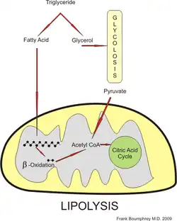 Triglycerides stored in adipose tissue and in other tissues, such as muscle and liver, release fatty acids and glycerol in a process known as lipolysis. Fatty acids are slower than glucose to convert into acetyl-CoA, as first it has to go through beta oxidation. It takes about 10 minutes for fatty acids to sufficiently produce ATP.[5] Fatty acids are the primary fuel source at rest and in low to moderate intensity exercise.[1] Though slower than glucose, its yield is much higher. One molecule of glucose produces through aerobic glycolysis a net of 30-32 ATP;[11] whereas a fatty acid can produce through beta oxidation a net of approximately 100 ATP depending on the type of fatty acid. For example, palmitic acid can produce a net of 106 ATP.[12]