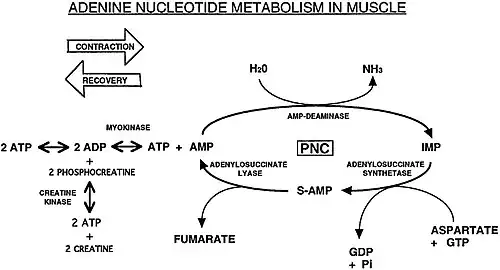 The purine nucleotide cycle is used in times of glycolytic or ATP crisis, such as strenuous exercise or starvation.[14][13] It produces fumarate, a citric acid cycle intermediate, which enters the mitochondrion through the malate-aspartate shuttle, and from there produces ATP by oxidative phosphorylation.
