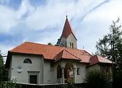 Northeast of the settlement's core stands St. George's Church, a chapel-of-ease of the Parish of Tržič. It is a 15th-century Baroque-redesigned Gothic church with a late-Gothic chancel and a coffered ceiling. The furnishings are from the 19th century.