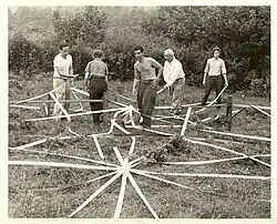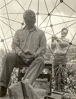 Black Mountain was experimental in nature and committed to an interdisciplinary approach, prioritizing art-making as a necessary component of education and attracting a faculty and lecturers that included many of America's leading visual artists, composers, poets, and designers.[2] During the 1930s and 1940s the school flourished, becoming well known as an incubator for artistic talent. Notable events at the school were common; it was here that the first large-scale geodesic dome was made by faculty member Buckminster Fuller and students, where Merce Cunningham formed his dance company, and where John Cage staged his first musical happening.[3] In the 1950s, the focus of the school shifted to the literary arts under the rectorship of Charles Olson. Olson founded The Black Mountain Review in 1954[7] and, together with his colleague and student Robert Creeley, developed the poetic school of Black Mountain poets.[8]