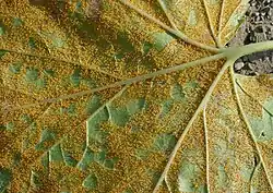 The blackcurrant, in common with other Ribes, is a telial (secondary) host of the white pine blister rust (Cronartium ribicola). The aecial (primary) hosts of the rust are the five-needle pines, including the eastern white pine (Pinus strobus).[5] The Ribes are largely unaffected by the rust but it significantly affects the growth of, and can kill, pines.[6][5] The blackcurrant, of all the Ribes species, is particularly susceptible to the rust.[4]