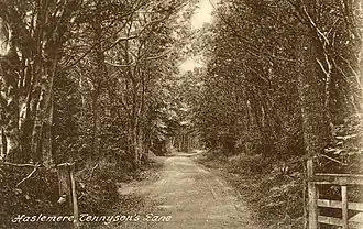 Tennyson's Lane is named in memory of the poet who lived here. The lane is a sunken, tree-tunnel lane that runs from Haslemere, past Aldworth House (today a couple of dwellings) to near the summit. The lane keeps to Arthur Paterson's description in 1905: