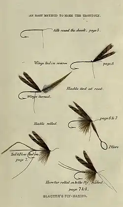 Blacker's Art of Fly Making - comprising angling and dyeing of colours with engravings of Salmon and Trout flies shewing the process of the gentle craft as taught in the pages with descriptions of flies for the season of the year as they come out on the water is a work of fly tying literature with significant fly fishing content written by William Blacker, a London tackle dealer and first published in London in 1842 by George Nichols.[1] The 1842 and 1843 editions were only 48 pages while, the 1855 edition was considerably expanded by Blacker with hand-painted, colored illustrations and 252 pages.