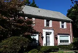 Carl W. Miller House; c. 1926; 32 Balton Road, Providence, RI; A two-and-a-half-story, brick-clad, Modern Colonial house with a central recessed doorway framed by pilasters and imposts with rosettes and an entablature broken by an architrave with a plinth block above, and flanked by bay windows. Miller was a professor at Brown University.
