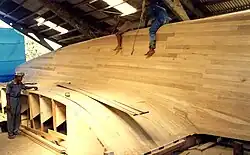 • Cold moulding is a composite method of wooden boat building that uses two or more layers of thin wood, called veneers, oriented in different directions, resulting in a strong monocoque structure, similar to a fibreglass hull but substantially lighter. Sometimes composed of a base layer of strip planking followed by multiple veneers. Sometimes just veneers are used.[13] Cold-moulding is popular in small, medium and very large, wooden super-yachts. Using different types of wood, the builder can lighten some areas such as bow and stern and strengthen other high-stress areas. Sometimes cold-moulded hulls are protected either inside or out or both with fibreglass or similar products for impact resistance, especially when lightweight, soft timber such as cedar is used. This method lends itself to great flexibility in hull shape.[14]