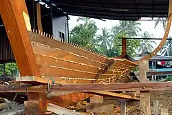 Construction of the Naga Pelangi in 2004, a Malaysian pinas, using traditional edge-dowelled techniques. Note the protruding dowels on the upper edges of the planks and the fiber caulking in the seams. The ribs will be added once the shell is complete.