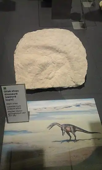 ![]() Cast of a tridactyl footprint of "Eubrontes" from the Triassic of the Czech Republic (sandstone quarry near Červený Kostelec) | |