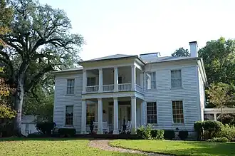 The Bragg House is a historic house in rural Ouachita County, Arkansas. It is a two-story Greek Revival house located about 4 miles (6.4 km) west of Camden, the county seat, on United States Route 278 (formerly designated Arkansas Highway 4). The house is basically rectangular in plan, with a hip roof. Its main entrance is sheltered by a two-story temple-style portico, with four columns topped with Doric capitals, and a turned-baluster railing on the second floor. Peter Newport Bragg began construction of the house in 1842, but did not complete it until 1850. The house was built out of virgin lumber sawn on Bragg's sawmill by his slaves; it remains in the hands of Bragg's descendants.[2]