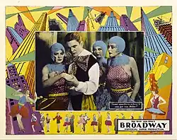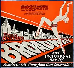 Broadway is a 1929 American musical crime film directed by Paul Fejos from the 1926 play of the same name by George Abbott and Philip Dunning. It stars Glenn Tryon, Evelyn Brent, Paul Porcasi, Robert Ellis, Merna Kennedy, and Thomas E. Jackson.[1]