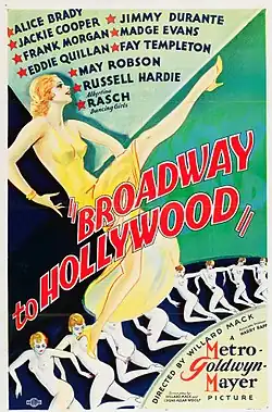 Broadway to Hollywood is a 1933 American pre-Code musical film directed by Willard Mack, produced by Harry Rapf, cinematography by Norbert Brodine and released by Metro-Goldwyn-Mayer. The film features many of MGM's stars of the time, including Frank Morgan, Alice Brady, May Robson, Madge Evans, Jimmy Durante, Mickey Rooney, and Jackie Cooper. Brothers Moe Howard and Curly Howard of The Three Stooges appear—without Ted Healy and without Larry Fine—almost unrecognizably, as Otto and Fritz, two clowns in makeup.[1][2] It was the first film to feature Nelson Eddy.[3]