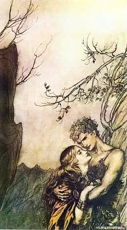 This poem dealt extensively with the meeting of Sigurd and Brynhildr. Illustration by Arthur Rackham.
