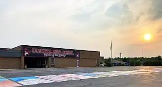 A variety of sports are offered at the high school including: Boys and girls cross country, boys and girls track, boys and girls soccer, football, cheerleading, Lady Bucks volleyball, baseball, softball, gymnastics, boys and girls basketball, wrestling, boys and girls golf, swimming, marching band, and bowling.[5] However, these sports are not free, but there is a fee that is required to participate. The amounts were set in the 2010–2011 school year and have remained constant since then. For the first sport the amount to be paid is $395.00, for the second sport it is $295 and for the third sport it is $195. For families with more than one child playing sports at Buckeye High School there is a family maximum that is set at $1,600 per year.[9] From 1953–1956 Buckeye belonged to the Medina County League. From 1957–1987, Buckeye belonged to the Inland Conference until it folded in 1987. Buckeye was Independent from 1988–1992. Buckeye belonged to the Mohican Conference from 1993–2003. Buckeye was Independent again in 2004. Buckeye belonged to the Patriot Athletic Conference from 2005–2018 (in which they were voted out due to their dominance). From 2019–2024, Buckeye belonged to the Great Lakes Conference until it folded in 2024. Buckeye then helped form the Cleveland West Conference.[10]