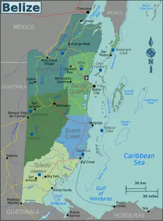 Buenavista del Cayo is located in the Mopan Valley of Belize above the junction of the Mopan and Macal rivers.[1] It is on the western side of Belize in the Cayo district. This region fosters diverse environmental zones with different agricultural and material resources.[1] The East Plaza is surrounded by relatively flat terrain and is the largest of Buenavista's plazas. Entrance points into the East Plaza include a causeway in the southwest area of the plaza and a large gap in the perimeter.[2] Buenavista del Cayo has open plazas, unrestricted access, and a layout for easy internal circulation.[1]