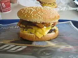 Since the 1980s, several parties, including the Center for Science in the Public Interest (CSPI), the City of New York,[11] and the Spanish government,[12] have argued that Burger King has contributed to obesity and unhealthy eating behaviors in Western nations by producing products that contain large amounts of salt, fat, trans-fat and calories.[13] After its purchase by TPG Capital from former parent company Diageo in 2002, the company introduced several large, oversized products including its European BK XXL line,[12] the Enormous Omelet Sandwich line and the BK Stacker line.[14][15] These new offerings, and others like them, have resulted in further international scorn and negative attention due to the large portion size and increased amounts of unhealthy fats and trans-fats in these items. Many consumer groups have accused Burger King and other fast food restaurant chains of failing to provide healthier alternatives.[16]