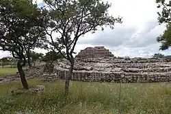 On site are seven enormous architectonic structures (pyramidal structures) of different sizes and styles, that form sunken patios, squares, a game of ball, esplanades, and a 1-kilometre-long (0.62 mi) road. Ceramic superficial vestiges found suggest that the last occupation would be tied chronologically to the Toltec expansion.