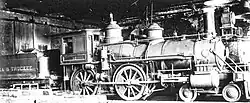 Virginia & Truckee RR 12, "Genoa," in its 20th-century configuration (e.g., straight stack, round headlight, etc.), before restoration.This is the Virginia & Truckee RR 12, "Genoa," which was built in 1873, after its restoration, which incorporated many of its 1800s design features.