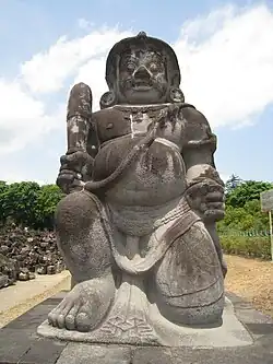 In East Javanese art and Balinese version however, the dvarapala usually depicted rather well-built and muscular, with a fine example taken from Adan-adan site near Kediri.[20] The exception is a gigantic dvarapala of Singhasari near Malang, East Java that measures 3.7 metres (12 ft) tall. The most notable dvarapala statues are those of candi Sewu, each pair guarding four cardinal points of the grand temple complex, making them a total eight large dvarapala statues in perfect condition. The dvarapalas of Sewu temple has become the prototype of Gupolo guardian in later Javanese art, copied as guardians in Javanese keratons of Yogyakarta and Surakarta. Another fine example is two pairs of dvarapala guarding the twin temples of Plaosan.