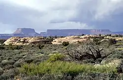 Canyonlands National Park contains a wide variety of plant life, including 11 cactus species,[34] 20 moss species,[35] liverworts,[35] grasses[36] and wildflowers.[37] Varieties of trees include netleaf hackberry, Russian olive, Utah juniper, pinyon pine, tamarisk, and Fremont's cottonwood.[38] Shrubs include Mormon tea, blackbrush, four-wing saltbush, cliffrose,[38] littleleaf mountain mahogany, and snakeweed[39]