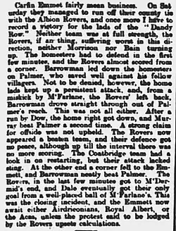 The club entered the Lanarkshire Cup every year until 1905–06, and the Qualifying Cup until 1907–08, but with increasingly diminishing returns; the club's final win in the Qualifying Cup was a 4–0 home victory over Longriggend in the first round in 1901–02, by which time "their ranks had been somewhat thinned",[17] with half-back Clifford being tried out at centre-forward, and scoring one of the goals.[18] The only other win it had in the Lanarkshire was over the soldier side of Hamilton Garrison in 1904–05, it being noted that Emmet had been inactive for most of the season.[19] Even in that case, the referee stopped the game shortly after half-time owing to the state of the Carfin pitch, but, with Emmet 3–0 up at the time of abandonment, Garrison ceded the tie rather than force a replay.[20] The financial struggle of trying to exist in an era of League football was shown by Emmet repeatedly switching Qualifying Cup ties in which it had been drawn at home to the "visiting" clubs, in return for a consideration; Albion Rovers paid £2 10s in 1902, and Clyde £8 in 1904.[21]