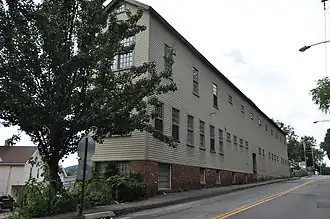 When this warehouse was built in 1897, it was described as one of the most advanced tobacco warehouses in the country, featuring all of the latest amenities. New Milford was then the primary center for processing tobacco leaf grown in the Housatonic River valley, used for wrapping cigars. It was built by Carl Schoverling, the son and nephew of two German immigrants who were major figures in the local tobacco industry. The building originally had wings extending to the west (where Housatonic Avenue) now runs, and was conveniently sited near the Housatonic Railroad. Its use by the Schoverlings was short-lived: the business closed in 1903, apparently due to setbacks caused by repeated crop failures. After passing through bank ownership, it was again used as a tobacco warehouse into the 1930s, after which it has been used by a variety of other businesses.[2]