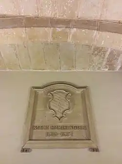 In 1735, artist Gio Nicola Buhagiar, was commissioned to paint her of which painting is found in the sacristy of San Anton Chapel where she rests.[27] The family's coat-of-arms features on several objects and places such as on Cosmana's tombstone and painting at the Parish Church, on silver artifacts which she left as dowry to the Roman Cathoclic Church in Malta and on the inside of Casa Cosmana Navarra's main entrance door.[28][29][30] Costmana wrote her doury in 1675 with local notary Nicola Allegretto.[31][32]