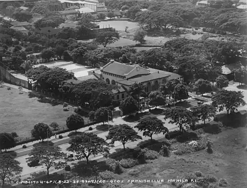 The structure used to occupy the whole block from Taft Avenue to San Marcelino Street and housed the offices of the Spanish Chamber of Commerce and the Consulate General of Spain.[7] As the official clubhouse and social venue of the Spanish community, the building's reception and banquet halls hosted parties, celebrations and balls. Among the noted events in this venue in the 1930s was the extravagant party held to celebrate the birthday of the King of Spain. Apart from attending parties in its halls, guests could also view the garden from the terrace while members could play tennis and pelota games in its courts.[1]
