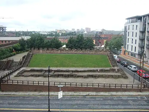 A Roman fort (castra), Mamucium or Mancunium was established in what is now Castlefield around AD 79 near a crossing place on the River Medlock.[7] The fort was sited on a sandstone bluff near the confluence of the River Medlock and Irwell in a naturally defensible position.[7] It was erected as a series of fortifications established by Gnaeus Julius Agricola during his campaign against the Brigantes, who were the Celtic tribe in control of most of northern England.[8] It guarded a central stage of the Roman road (equivalent to Watling Street), between Deva Victrix (Chester) and Eboracum (York). Another road branched off to the north to Bremetennacum (Ribchester).[9] The neighbouring forts were Castleshaw and Northwich.[10] Built first from turf and timber, the fort was demolished around 140. When it was rebuilt around 160, it was again of turf and timber construction.[11] Around the year 200, the fort underwent another rebuild enhancing its defences by replacing the gatehouse in stone and facing the walls with stone.[12] The fort would have been garrisoned by an infantry cohort of around 500 auxiliary troops.[13]