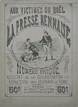 In addition, the editors of various Rennes newspapers collaborated to produce a collection of poems with an account of the disaster and engravings, in a single issue, "for the benefit of the victims of the Boël disaster."[1] Collaboration occurred between the republican, monarchist and theatrical press.[10] In support of this initiative, the printers provided the material free of charge.[10] This illustrated newspaper was put on sale at the price of 50 cents[2] on Sunday July 6, 1884.[10]