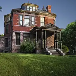 • Joe Kirby Home, 350[a] North Duluth Avenue: An 1880 build with Richardsonian Romanesque elements, it is one of the oldest homes in the district. It has a Sioux Quartzite exterior with heavy decorations made of the same material along the window lintels and transoms. The main door is framed by an archway and is adjacent to a small porch with a conical roof. The home also has a round turret tower.[2]: 3