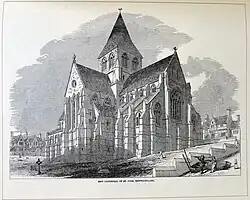 The present cathedral was begun in 1847 by Edward Feild, the second Bishop of Newfoundland and Bermuda. Feild commissioned plans from a leading Gothic Revival architect, George Gilbert Scott, who envisioned a more impressive cruciform structure, with varied ornamentation in the 12th-century English style. The nave, built between 1847 and 1850, served as the entire cathedral church for 35 years. Scott's assistant, architect William Hay, oversaw the nave's construction.[7] In the City of Hamilton, in Pembroke Parish (where St. John's Church was already the parish church), Bermuda, a chapel-of-ease (designed by James Cranston of Oxford in 1844 and completed in 1869) named Trinity Church was also erected, with an adjacent Bishop's Lodge. This was destroyed by arson in 1884 and William Hay, who had been consulted on the construction of Trinity Church in 1848-1849 and again in 1862, was hired in 1885 with his partner, George Henderson, to design the current structure, which was completed in 1905 and became the Cathedral of the Most Holy Trinity when the Bishop of Bermuda was established as separate from the Bishop of Newfoundland in 1919).