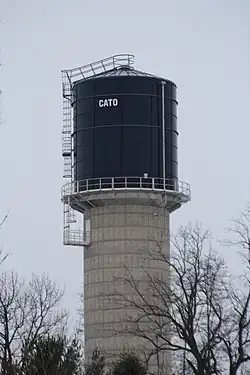 The Cato water tower stands 120 feet (37 m) over the village of Cato, to the northeast of the village center. The light blue structure had been a landmark for 75 years or more but was to be torn down as of June 2012. The new water tower was to be dark blue on top and still say "Cato" on both sides. It will sit on 82 feet (25 m) of concrete. It will also be bigger, holding 25,000 extra gallons of water, in anticipation of future town growth.