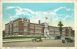 By 1920, inspectors from the University of Illinois and the Illinois Department of Education were dissatisfied with the high school facilities at St. Mary's School.[7]: 207 With the student body growing,[32] land for a separate high school building next to Holy Trinity Church at 712 North Center Street[33] was purchased from the Dominican sisters in summer 1922 for $25,000.[nb 4][7]: 201 However, due to the poor health of pastor Michael Weldon, construction was postponed until after his death[7]: 207 The cornerstone of the school building was laid on 25 September 1927.[7]: 223 Costing $285,000,[nb 5] the building was completed on 3 September 1928 and opened one week later as Trinity High School.[7]: 224 Fifty-nine seniors graduated the following June.[10] The St. Mary's School building was renovated in summer 1928 and continued to serve as Holy Trinity Grade School[7]: 226 before demolition in 1969.[34]