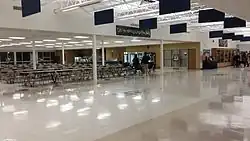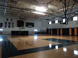 Enclosing more than 100,000 square feet[11] with a capacity for 500 students,[64] the school building is divided into two wings.[11] The academic wing contains sixteen classrooms, four science labs, two art labs, computer lab, and the student center. The social wing is bounded on one end by the 1400-seat Cvengros Gymnasium and on the other by the performing arts center - a 560-seat auditorium, audio lab, band room, and chorus room. Between are a 100-seat chapel, cafeteria, commons area, faculty dining area, welcome center, main office, weight room and four locker rooms.[11][15][62]