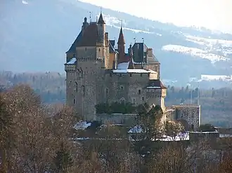 The Château de Menthon is a medieval castle located in the commune of Menthon-Saint-Bernard, 12 kilometres (7.5 mi) south of Annecy in the Haute-Savoie department of France. Standing on a 200 metres (660 ft) tall rock, its stone towers loom over Lake Annecy, the Roc de Chère National Nature Reserve, and Menthon-Saint-Bernard. Since 1989, it has been listed as a monument historique by the French Ministry of Culture.[1]